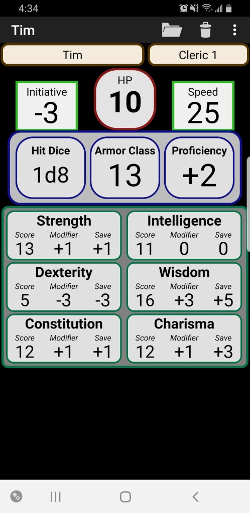 The next app I tried was Fifth Edition Character Sheet by Walter Kammerer. This was an offline option, something that is important to me which was a good improvement over D&D Beyond. This is an app that a few of my players use so I wanted to try it out. Building a character with this app was very easy as it had a step by step process, and it was very quick and responsive. However, the app as a whole felt very plain, with a black background on every screen and very little is done to make it visually interesting. Different screens would have different colors, sometimes to the point that it was jarring, and successfully navigating this app requires memorization as there is no visual guide.