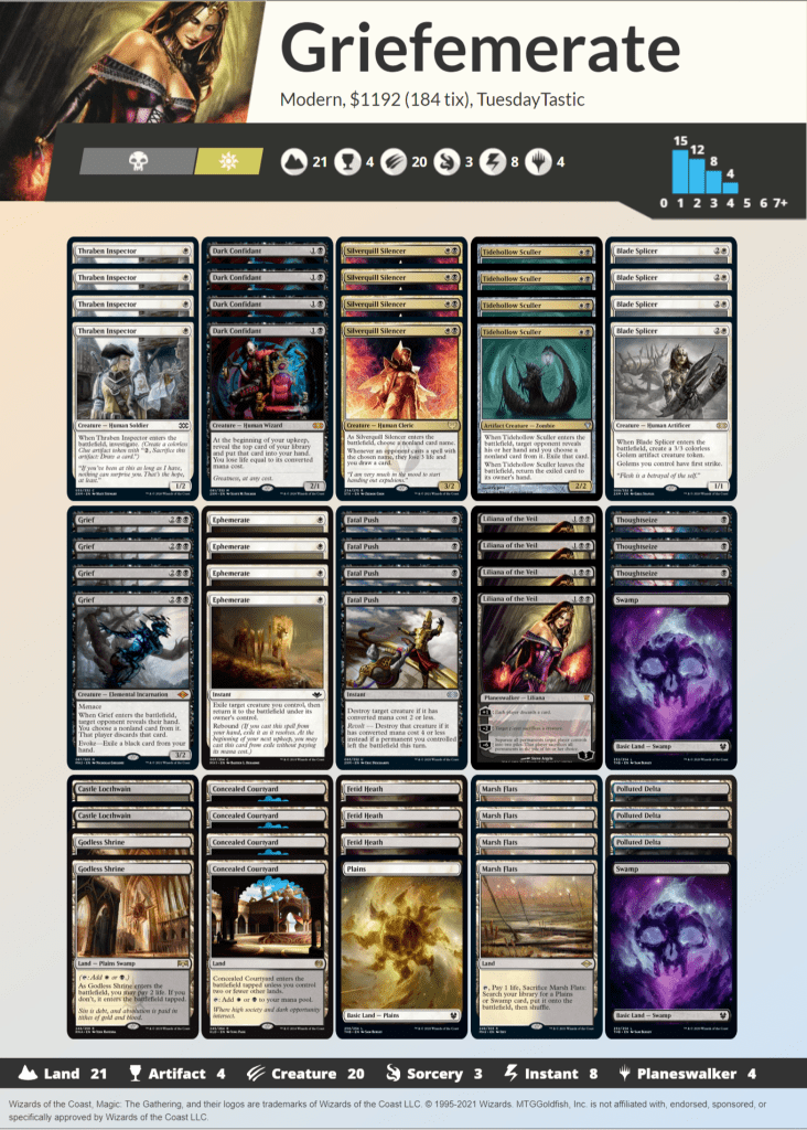 One of the first interactions everyone noticed during spoiler season was the powerful interaction between Grief and Ephemerate. For one mana on turn 1 you can Thoughtseize up to three cards from your opponents hand. It does require three cards from your hand as well, but you end up with a 3/2 menace when the dust settles. Nothing in Modern is capable of putting everyone down to such a low resource game as quickly as this combo. Building around it is a little challenging as you need to make sure you have enough cards to exile to Grief to enable that while also having cards that interact favorably with Ephemerate for when you can’t get that combo online. Tidehollow Sculler is a powerful option because if you respond to the etb trigger you can exile one card for free. Silverquill Silencer punishes them for whatever is left in their hand, and Liliana of the Veil is very difficult to combat when your starting hand is suddenly 4 cards.