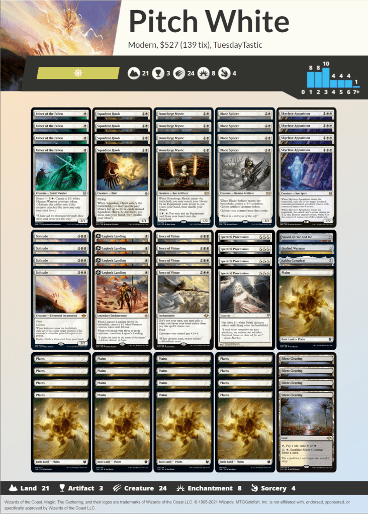One mechanic that is unique to white can be found in Squadron Hawk. For two mana you get a 1/1 flyer, and more importantly you get to put three more into your hand. This fodder works excellently with Solitude as well as another card from the last Modern Horizons set Force of Virtue. These cards combined turn a dinky Squadron Hawk into one of the best draws of the deck. On turn two you can get a 1/1, exile their creature, and then play an anthem on your turn and you’ll still have a Hawk left over. And they said white couldn’t do broken things. Another card to showcase from Modern Horizons 2 is the brand new addition to the Stoneforge package in Kaldra Compleat. If doing cute things with Squadron Hawk isn’t enough to get the job done simply put a two mana 5/5 trample, indestructible, hasty creature into play by turn three.
