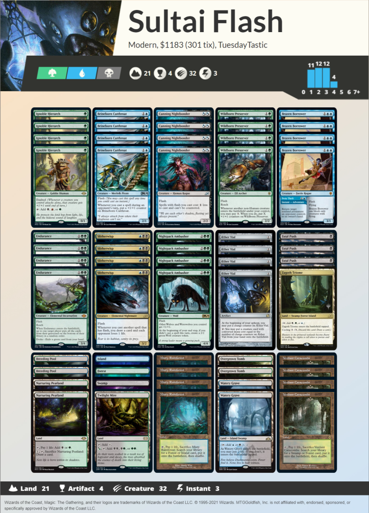 Modern Horizons has become one of my favorite auxiliary products to come out from Wizards in the past few years. The excuse to print more powerful cards than what is typically allowed can create brand new archetypes or breath life into decks that were considered dead. Disregarding the occasional Hogaak ruining Modern for a few months these sets have so much to offer for brewers. Today I’d like to share some brews of mine in anticipation of the release on June 18th.