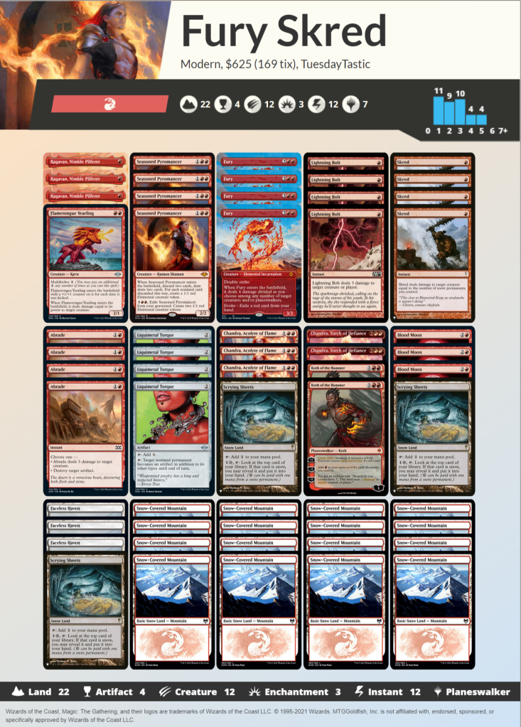 Out of all the decks I have made today none got quite as many cards from Modern Horizons 2 as this last one. Starting off with the reason behind the deck is of course Fury. Five mana 3/3 double-strike is a good body especially when it kills a creature or planeswalker on its way in. This led me towards Skred an archetype that has existed for almost as long as Snow-Covered Mountains have existed. This archetype got so many goodies from MH2 allow me to just name a few. Ragavan, Nimble Pilferer is simply one of the best one drops of all time and with all the removal this deck packs there won’t be anything that can block it. Flametongue Yearling, a cute callback to FTK, is a really efficient two for one that scales with your mana. Finally, maybe one of the best additions to Skred is Liquimetal Torque which turns Abrade into a nonland Vindicate. All of this combined breathes new life into a classic archetype and hopefully can bring it back to speed in the new modern metagame.