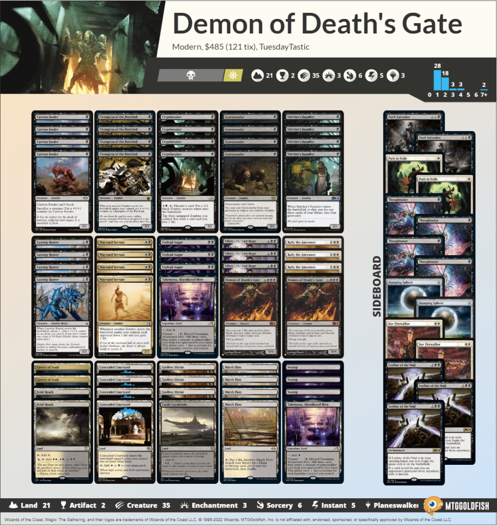 However, while there are flaws, this deck can still do some really powerful things. [mtg_card]Murktide Regent[/mtg_card] shows just how powerful a huge flying creature can be, and you’ll never see anything on the battlefield as big as [mtg_card]Demon of Death’s Gate[/mtg_card] on turn two. [mtg_card]Path to Exile[/mtg_card] is at an all-time low, and it is hard to counter the demon if you only have one land in play. This deck is also packed with synergy which turns forgotten commons like [mtg_card]Lazotep Reaver[/mtg_card] into one of the most potent enablers in the deck. [mtg_card]Rally the Ancestors[/mtg_card] being a one card combo kill makes it easy to sideboard it out against graveyard hate and instead focus on other lines. [mtg_card]Undead Augur[/mtg_card] can draw a disgusting amount of cards outgrinding anything, while also digging you towards your sideboard hate.